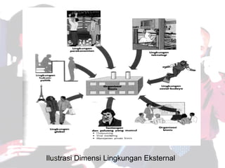 Dimensi lingkungan eksternal mencakup faktor-faktor di luar kendali organisasi, seperti: